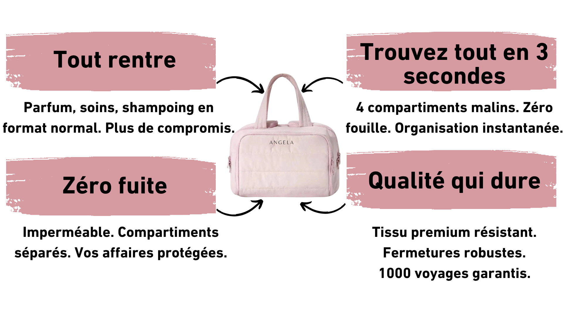 Le sac est composé de 4 compartiments bien pensés : deux espaces principaux pour les produits volumineux, deux poches zippées pour les petits objets, et des emplacements pour les brosses, crèmes ou bijoux. Chaque chose trouve sa place.